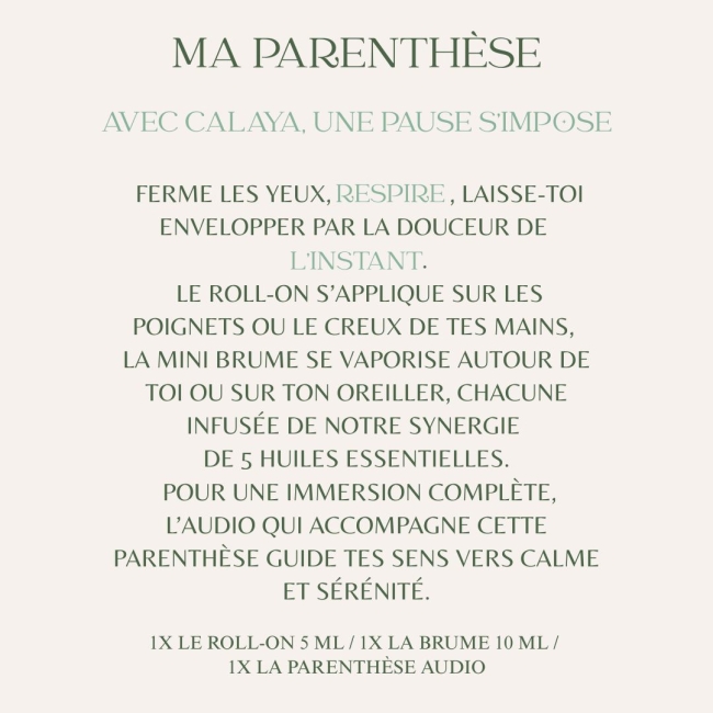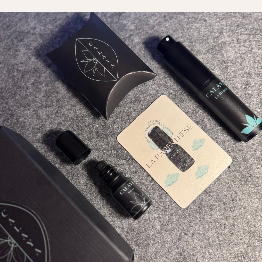 C’est un coffret pour mettre le monde sur pause : quelques respirations, un geste, une brume… et te voilà reconnectée à ton calme intérieur.